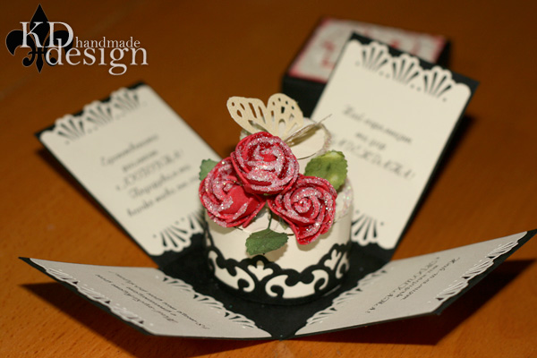 Днес правих една магическа кутийка и се сетих, че имам една правена за рожден ден, която е малко по-различна от тези, които съм показвала досега и която не съм споделяла с вас. Нямам дори добри снимки, но тогава я правих много набързо, завърших я късно вечерта и веднага дойдоха да си я вземат, та нямаше време да снимам както трябва. Не си личи много, но това вътре е тортичка, която както се вижда съм снимала от ъгъл, от който изобщо не си личи. Дори съм забравила да снимам как изглежда отвън (blush). И все пак ето я и нея :-).